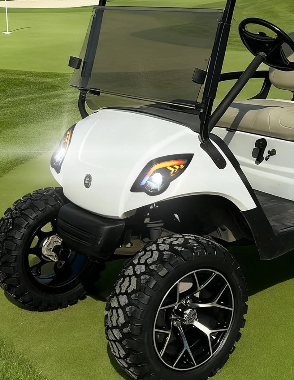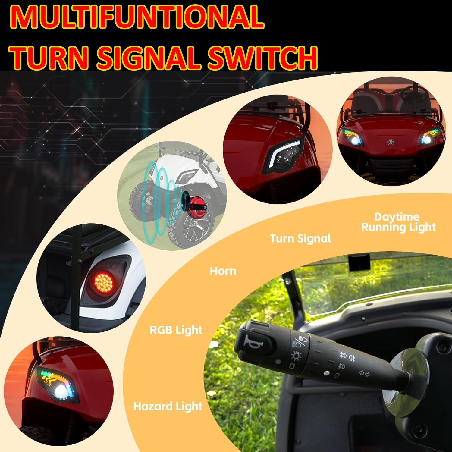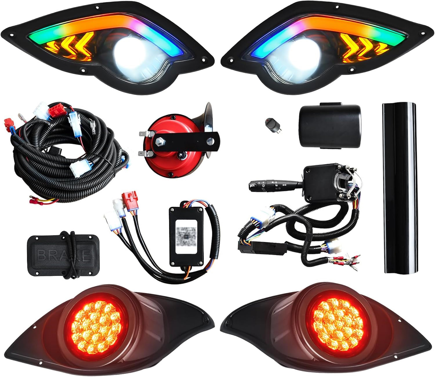 - Package includes 2×RGB LED headlight (1×left headlight, 1×right headlight), 2× LED taillight (1×left taillight, 1×right taillight), 1×wiring harness,1x golf cart turn signal kit, screw set, cutting template.